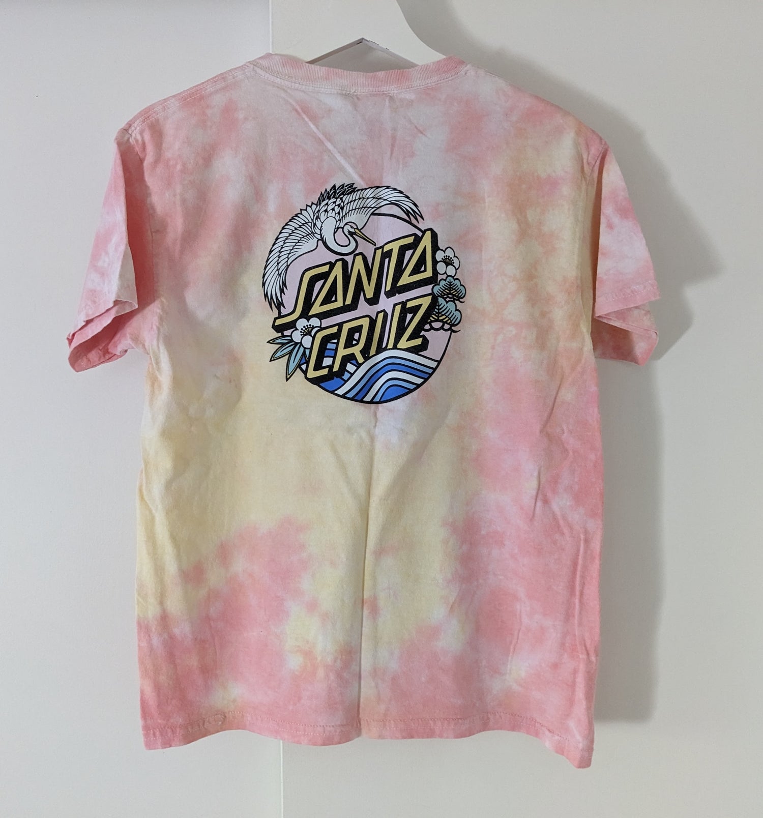 - Pink and yellow tie dye Santa Cruz shirt with River Crane graphic